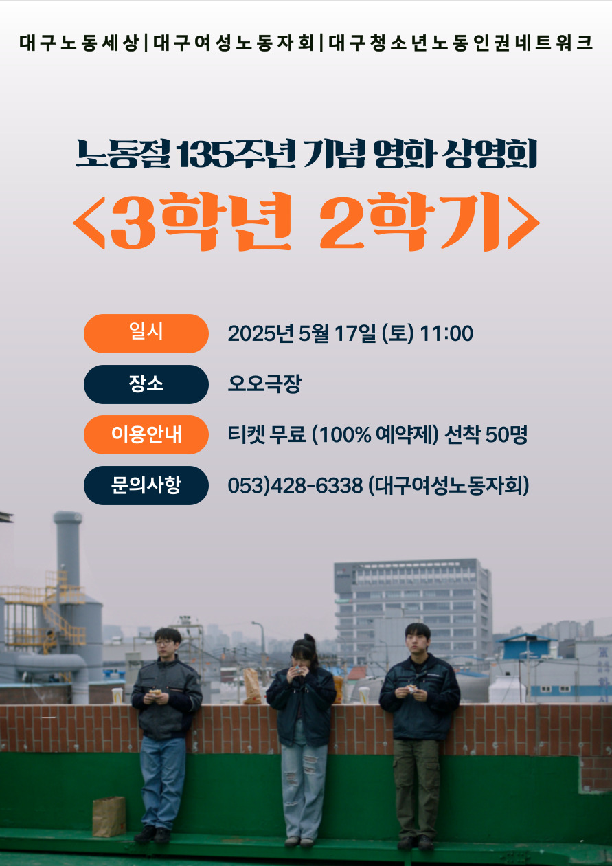 135주년 5.1 노동절을 기념해 무료 영화상영회를 합니다. 영화 <3학년 2학기>는 이란희감독의 작품으로 작년 제29회 부산국제영화제에서 한국영화감독조합 플러스엠상,송원 시민평론가상을 받기도 했습니다. 직업계 고등학교 3학년 2학기 현장실습을 나간 창우가 만나게 되는 노동현장의 이야기가 담담하게 그려집니다. 많은 참여 바랍니다!