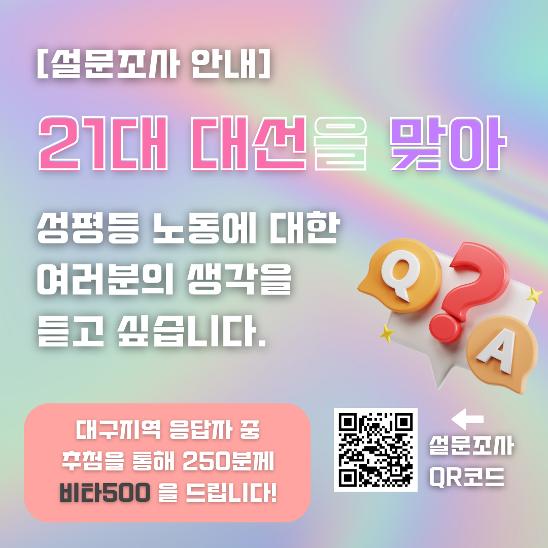 21대 대선에서 성평등 노동의 목소리가 반영될 수 있도록, 설문에 함께해주세요!